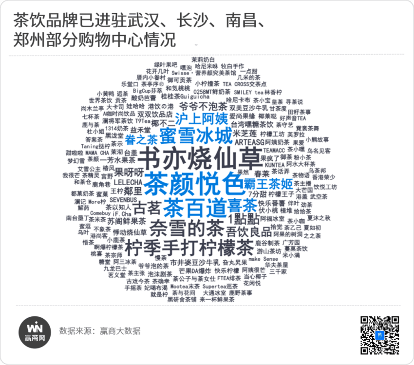 当我们透过长沙,再次聚焦至华中市场,据赢商大数据的不完全统计下,武汉、长沙、郑州、南昌四个省会城市,已进驻购物中心的茶饮品牌达200个,其开出的门店有1675家。这其中便包含了茶话弄、古茗、茶百道、喜茶等品牌。