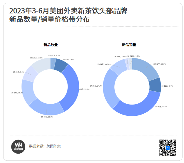 从美团外卖今年3月到6月的头部品牌上新数量分布来看,13元到20元以下的区间新品数量占比达到53%,结合到市场销量来看,新茶饮销量最高的实付外卖价格段也处于58.3%占比。