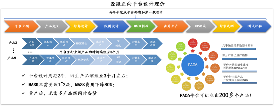 为何能够快速出SKU,源微创始人张义这样解释道:“如果要满足一个新需求,需要根据客户需求来重新定义、设计、流片、封装,然后交给客户验证,开发周期平均是1.5~2年,当前国内公司几乎每一款新品都要做一遍这个流程。而源微的正向平台设计理念,将开发周期从2年缩短至3个月,3个月的时间我们的平台设计就可以给客户交样片验证了。一个P06平台设计可以出256个产品线和SKU。而这样的平台,根据行业不同,我们一直在迭代。”“举一个简单的例子,一颗新品流片有30多层,掩膜MASK也需要30多层,我们的平台设计可以复用前面28层,只修改最后2层的金属层,掩膜和流片成本一下子降低了80%,即使量产后,也无需多产品线和SKU同时备货。”