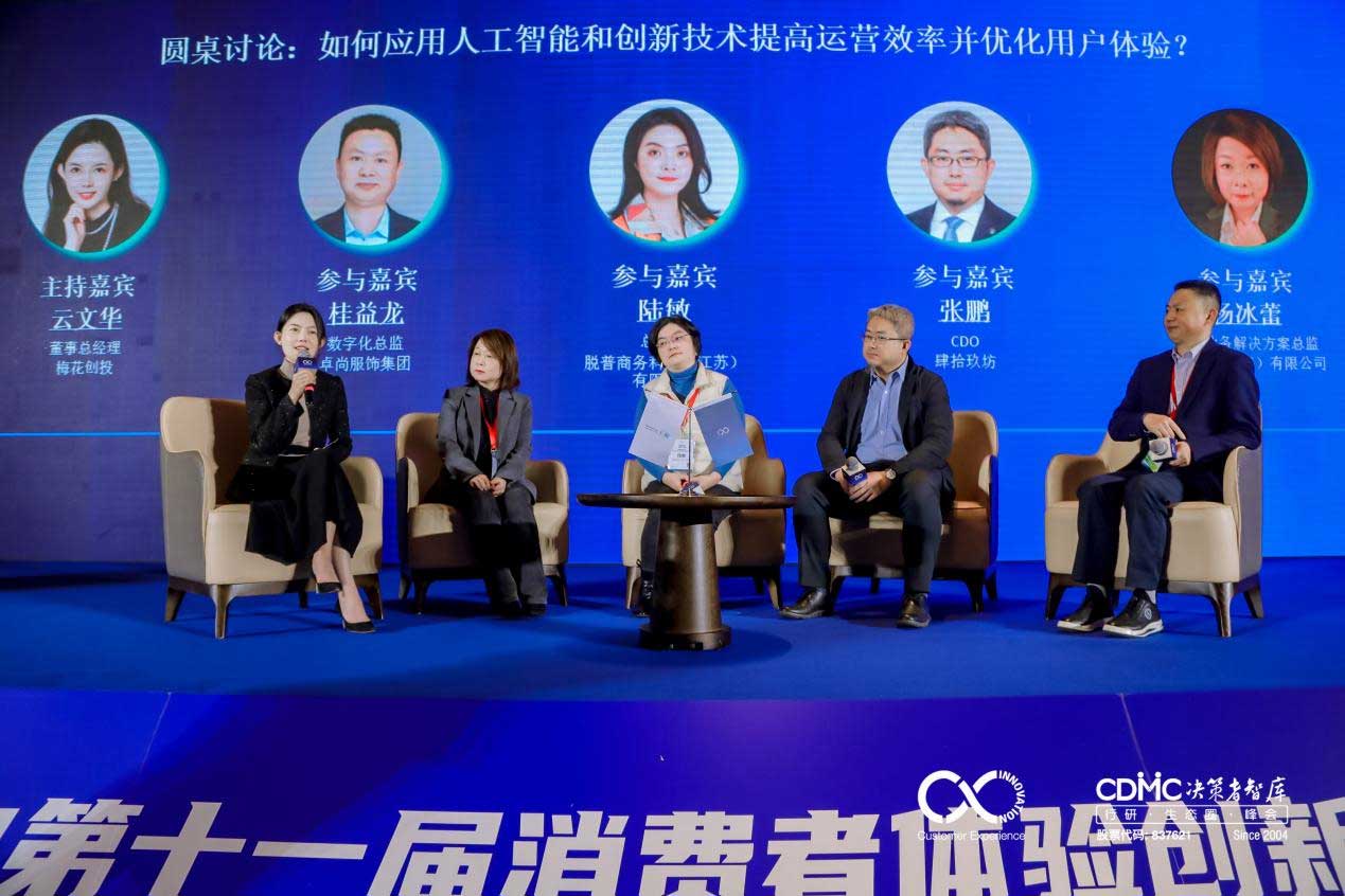 上午场的最后环节是圆桌讨论,主题为“如何应用人工智能和创新技术提高运营效率并优化用户体验?”。圆桌由梅花创投董事总经理云文华女士担任主持嘉宾,妮维雅(上海)有限公司综合业务解决方案总监杨冰蕾女士、脱普商务科技(江苏)有限公司总经理陆敏女士、肆拾玖坊CDO张鹏先生以及卓尚服饰集团数字化总监桂益龙先生一同参与讨论,重点探讨了不同行业和业务领域的AI人工智能技术应用,AIGC、大模型等创新技术如何赋能企业研发、生产、销售等环节,同时针对新兴技术领域,分享了对于未来消费行业发展趋势的洞察和期许。