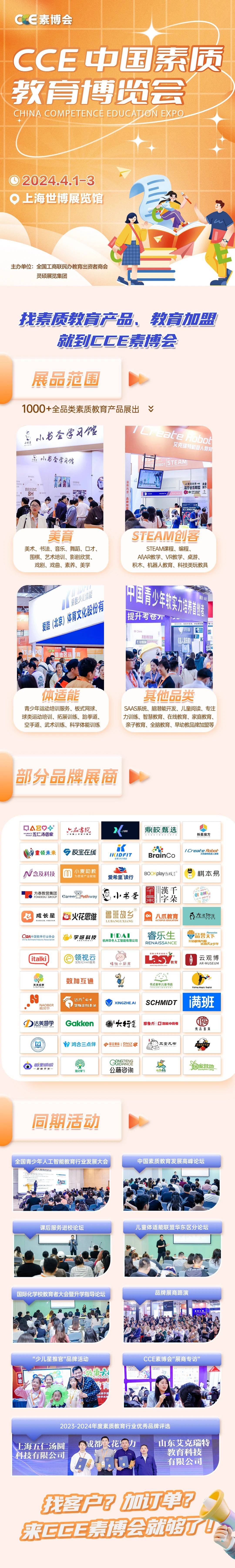 2024年4月1-3日、CCE中国(上海)素质教育博览会将在上海世博展览馆与大家见面,更大规模、更高规格敬请期待!本届展会由全国工商联民办教育出资者商会、灵硕展览集团联合主办,以“3天展期+365天精准对接”服务为引擎,打造一站式素质教育商贸对接平台。