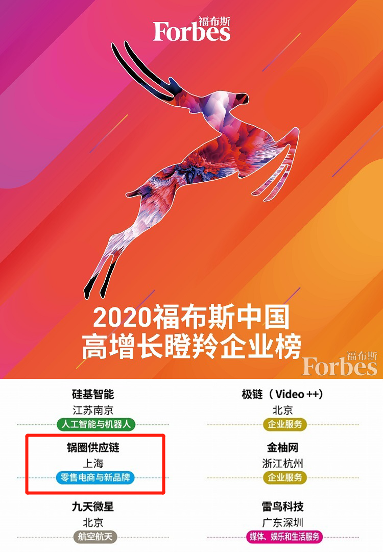 近日,福布斯中国“2020高增长瞪羚企业榜单”重磅揭晓,锅圈食汇在零售电商和新品牌赛道中脱颖而出,一举登榜。