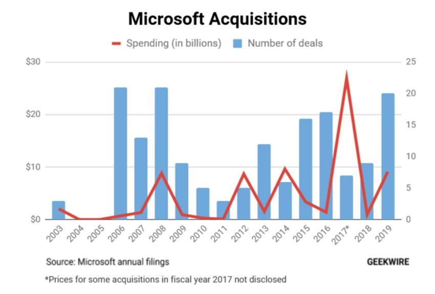 图 微软近年来的收购笔数及金融,图片来自Geekwire