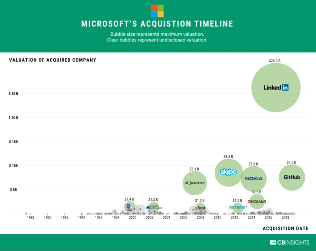 截至2018年末微软的大型收购案,图片来自于cbinsights