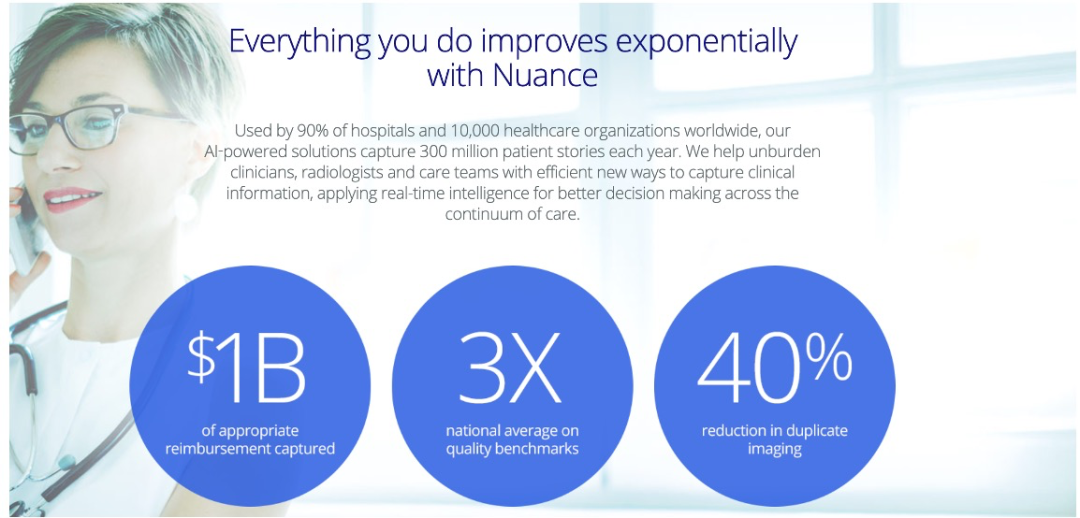 而事实证明Nuance的在医疗领域的发展也十分迅速,据Nuance官网显示,他们由AI驱动的解决方案已被全球90%的医院和10000个医疗组织所采用,美国一半以上的医生都在使用 Nuance提供的智能医疗服务。
