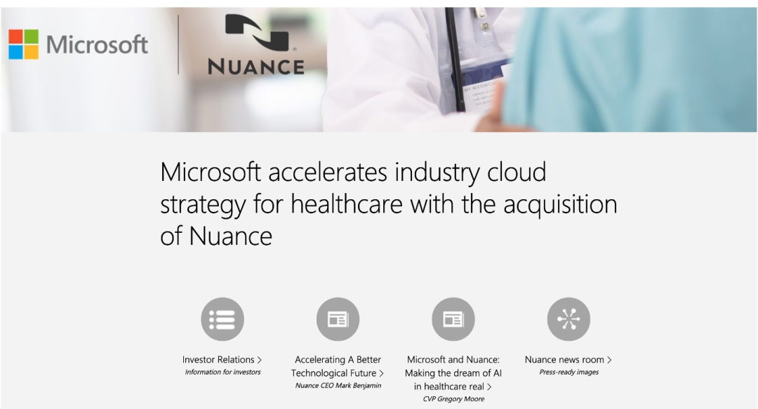 而在这些重大战略的推进之中,微软也在全球范围内跟众多医疗机构、技术公司进行合作,其中,Nuance也是其中一员。在今天的收购发生之前,Nuance其实已经跟微软进行了两年多的合作。