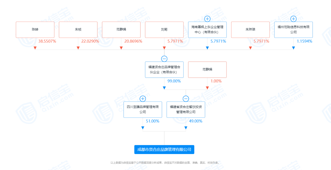 根据官微声明的“成都市贤合庄品牌管理有限公司”进行追踪,便会发现这种高度联结,在资本端展现得更为直观。上述公司股东分别为四川至膳品牌管理有限公司(持股51%)和福建省贤合庄餐饮投资管理有限公司(持股49%),陈赫在持股后者99%的福建贤合庄品牌管理合作企业中占股38.55073%,朱桢占比22.02899%。