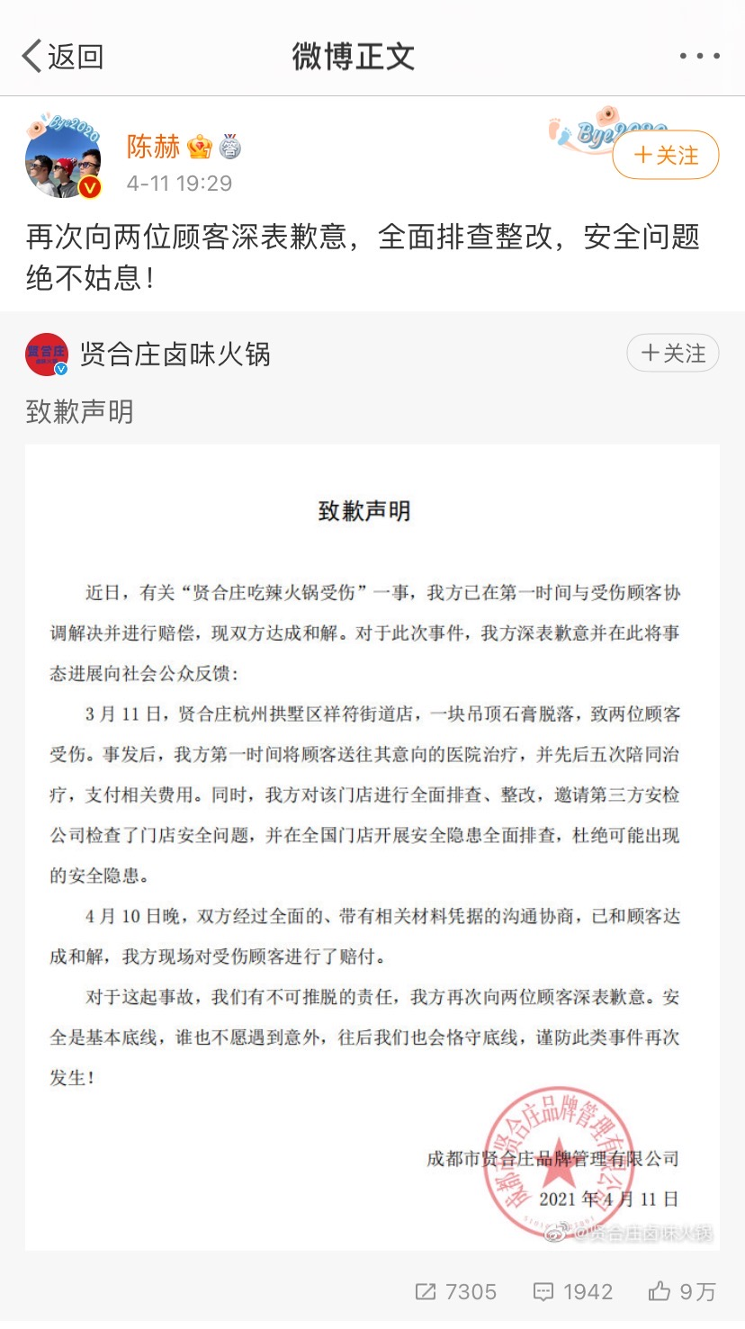 4月11日,也就是事发整整一个月后,贤合庄发表致歉声明表示已与受伤顾客达成和解,并将在全国门店开展安全隐患全面排查,同日,“明星合伙人”陈赫也转发表态“安全问题绝不姑息”。不过该事件仍以“陈赫火锅店”的形式被传播和关注,抖音上“贤合庄”的话题播放量达到11亿,仍在快速上涨。