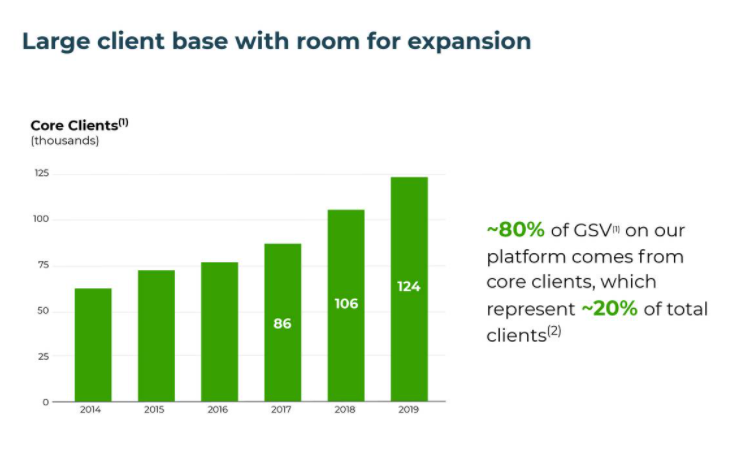 Upwork的客户增加量也是很大的,从2017年的8.6万人到现在的14万人左右,每年平均增长20%。
