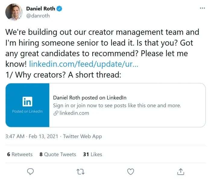 LinkedIn主编Daniel Roth近日在Twitter上发文写道:“创建者是领英的驱动引擎。”Roth表示,他正在招聘一位社区负责人向他汇报工作。招聘广告上称,社区负责人将建立并管理一个全球团队。