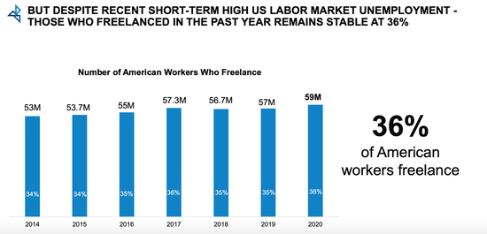 去年Upwork为CNBC提供的“高薪自由职业者职位列表”中显示,高薪自由职业者每年平均可赚取9万美元,甚至更多。在疫情期间,美国有1/3以上的劳动力、近6000万人是自由职业者,为美国经济贡献了1.2万亿美元,它仍然构成了美国经济的重要比例,也是适应经济困难时期的重要组成部分。