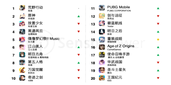 2020年第四季度中国自研手游 日本市场收入榜TOP20(来源:Sensor Tower)