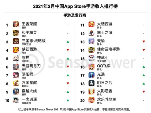 根据Sensor Tower的数据,2021年2月,在中国App Store手游收入排行榜的前20位中,网易占据7个位置,腾讯占了8席。随着新品不断推出,这两家巨头的游戏业务基本盘仍将壮大,并持续新陈代谢。