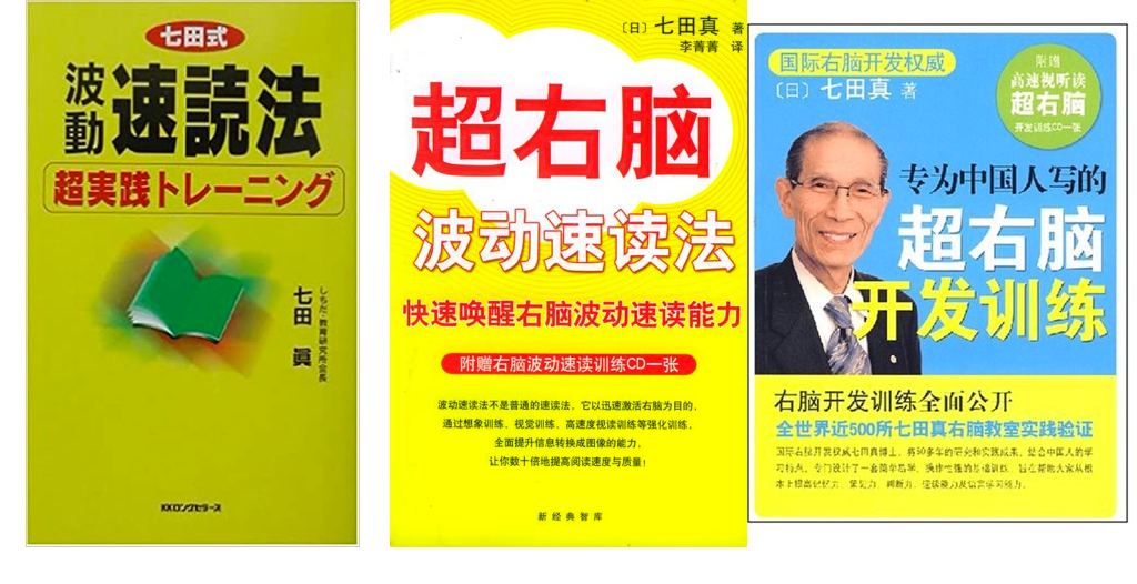 国内唯一一本中文波动速读教材,就是翻译自他的《超右脑波动速读法》,2002 年在日本出版,2005 年译成了中文。此外,七田真还「专为中国人」写了一本右脑开发手册,手册重点也是如何实践速读法。