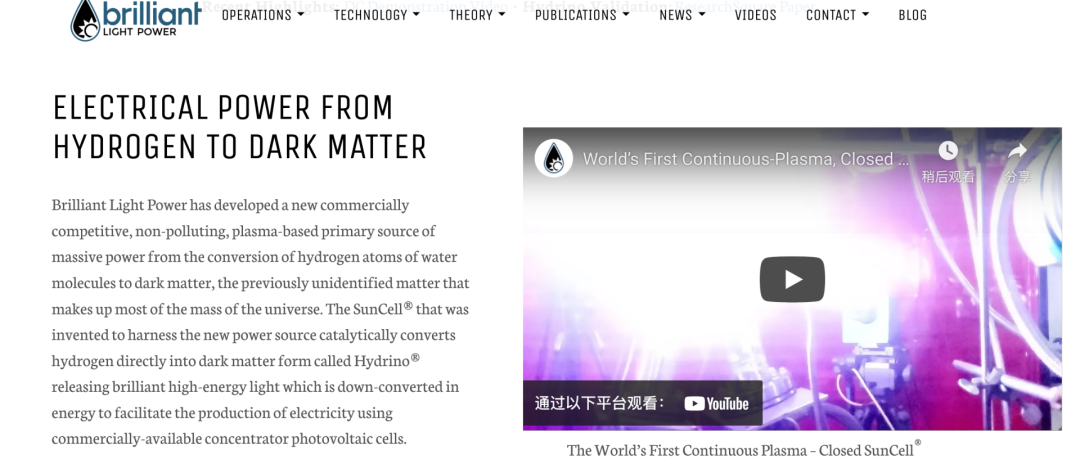 在改名「辉光能源」后,他们这次的方案是把水中的氢原子转化为暗物质,「转化过程中能够释放出高能量的光线,这种光线利用市场上可以买到的浓缩光伏电池就能产电」。