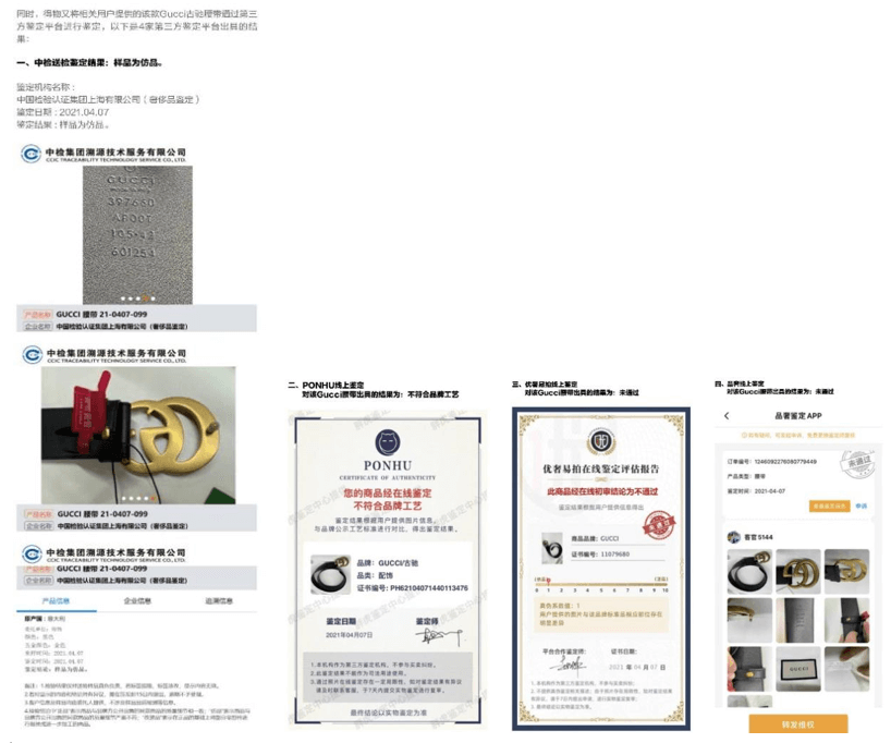 唯品会与得物都出具了第三方平台的鉴别证明为自己站台,而Gucci中国则将自己置身事外:“暂不发表意见。”至今,谁是谁非、孰真孰假仍无从判定。