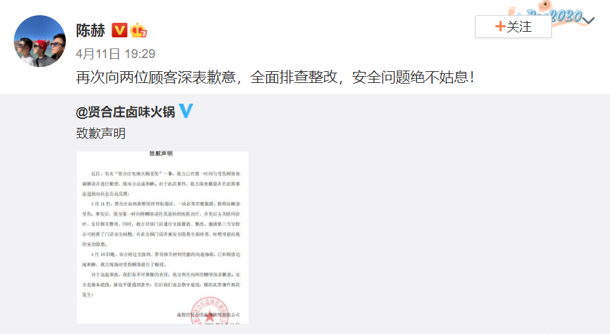 前几天,贤和庄火锅店因天花板掉落烫伤顾客,明星火锅店重回人们视野。随后,贤和庄老板、演员陈赫发微博道歉并表示全面排查整改。