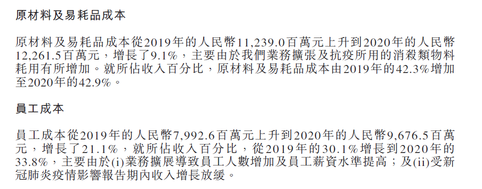 呷哺呷哺2020年的成本和费用虽然没有增长明显,但是由于收入下降,各项支出占收入比例明显增加。