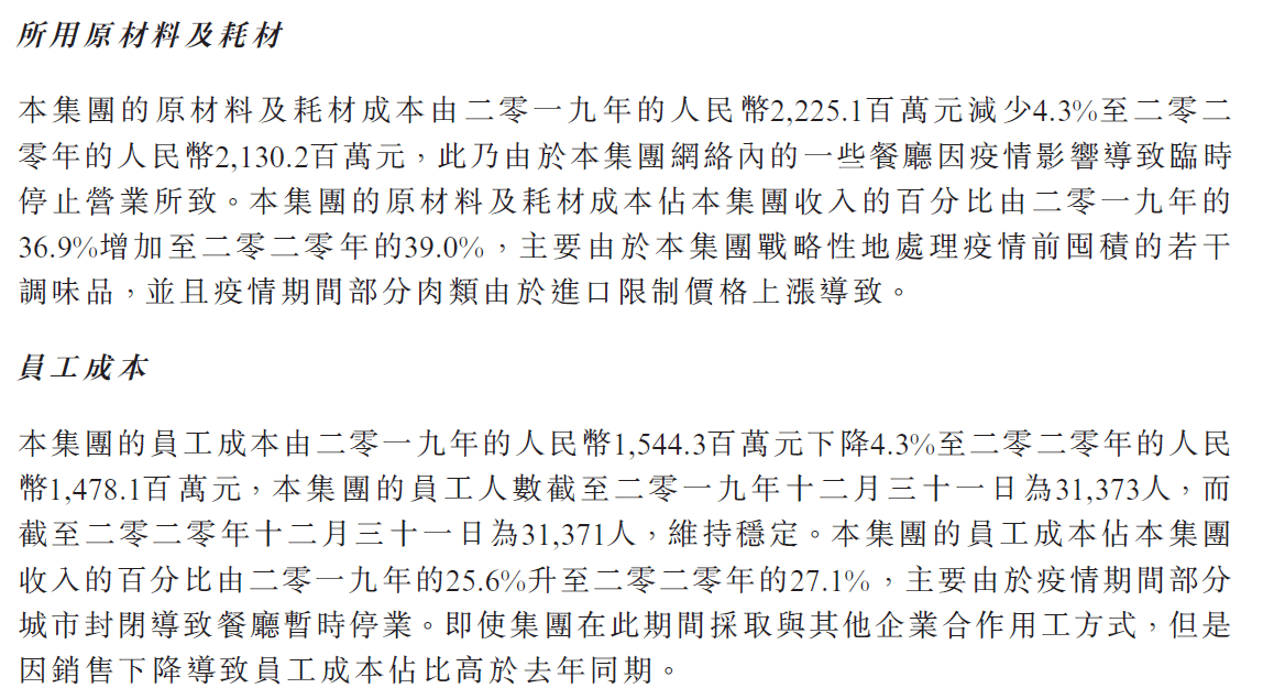 2020年,呷哺呷哺的原材料及耗材成本为21.3亿元,同比减少4.3%,该成本占收入百分比由36.9%增长至39.0%;员工成本方面,2020年呷哺呷哺员工成本下降至14.78亿元,同比下降4.3%,其占收入百分比为27.1%,同比增加1.5%个百分点;物业租金及相关开支则因为业主减租减息等原因有所下降,占收入的比例从2019年的4.2%降至4%。
