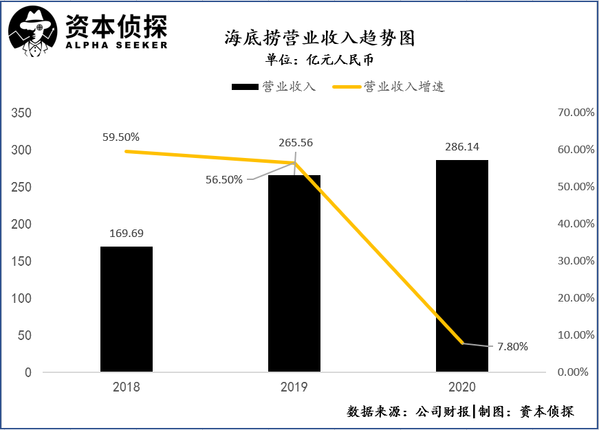 2020年,受疫情影响,线下餐饮受到严重冲击。根据财报,海底捞2020年营收为286.14亿元,同比增长7.8%,对比2019年56.50%的营收增速差距明显;公司拥有人应占净溢利3.09亿元,同比减少86.8%。