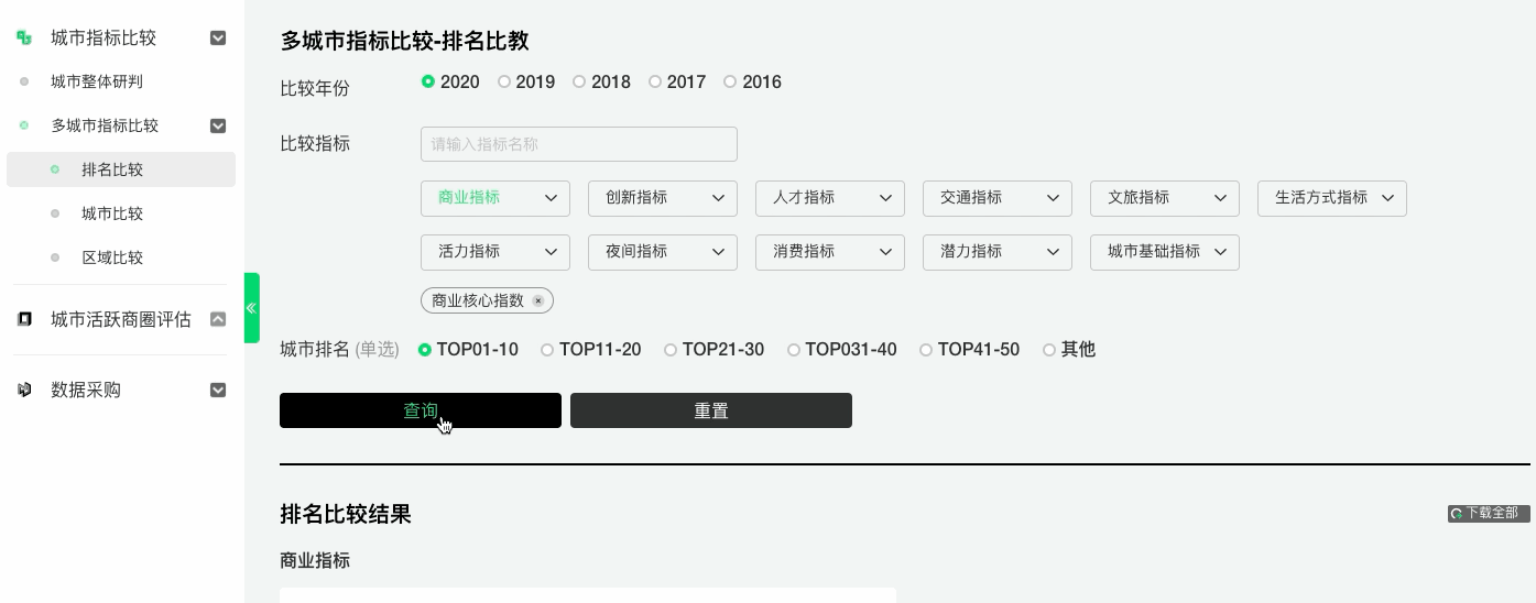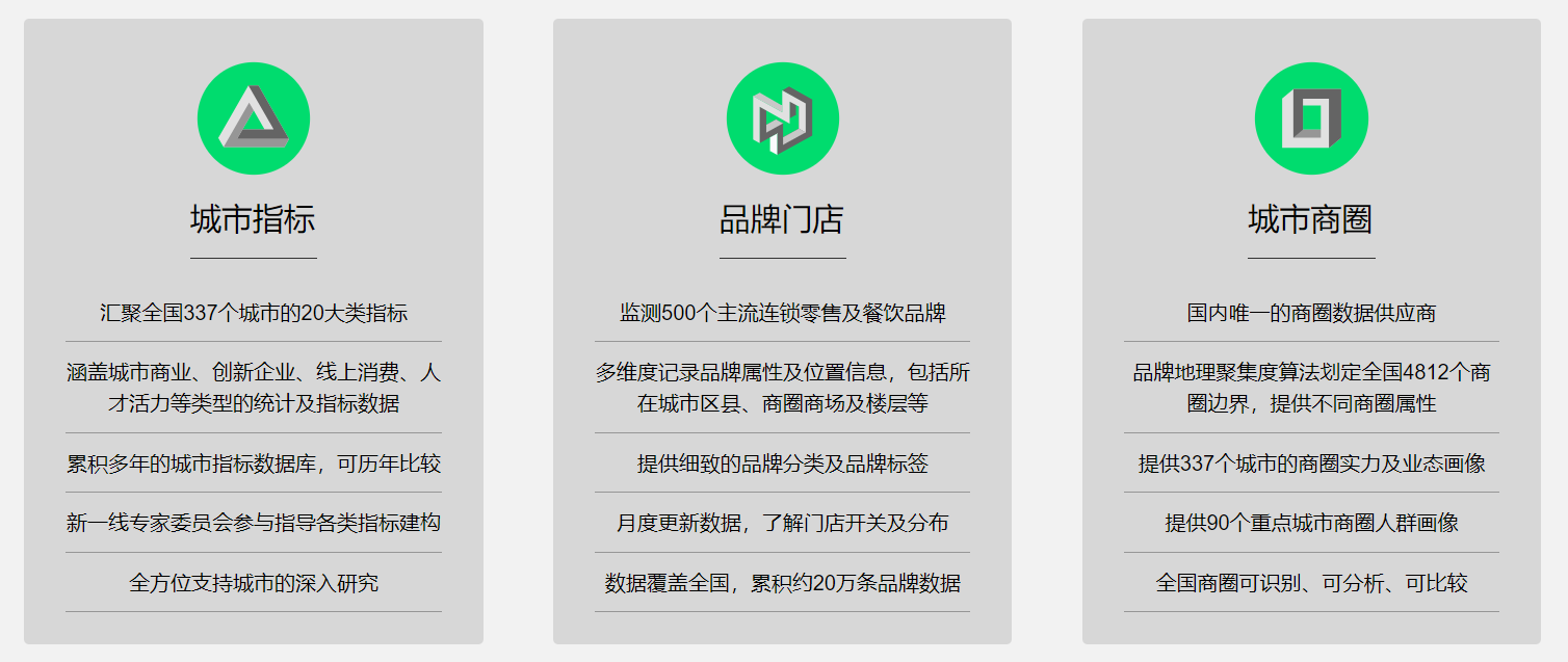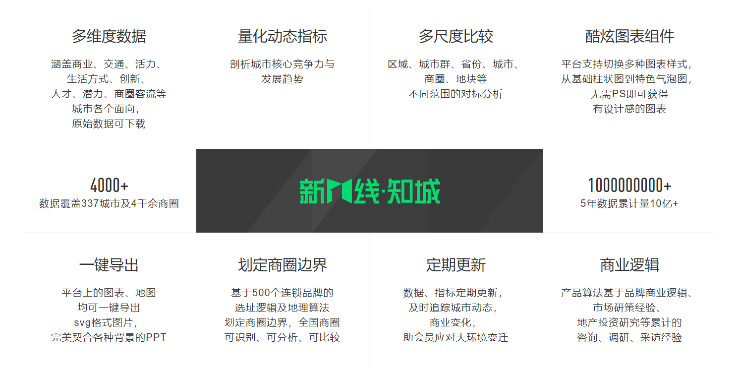 三、知城数据平台:在2020年,新一线城市研究所推出的首个付费数据平台产品——知城数据平台。该SaaS平台以新一线城市研究所累积的城市榜单、知城指标体系、五大城市数据库、专业的指标算法为基础,为城市管理者、商务需求方、广大读者提供感兴趣的数据、分析与研究产品,并输出标准化的数据查询、数据分析、数据采购、数据可视化服务。