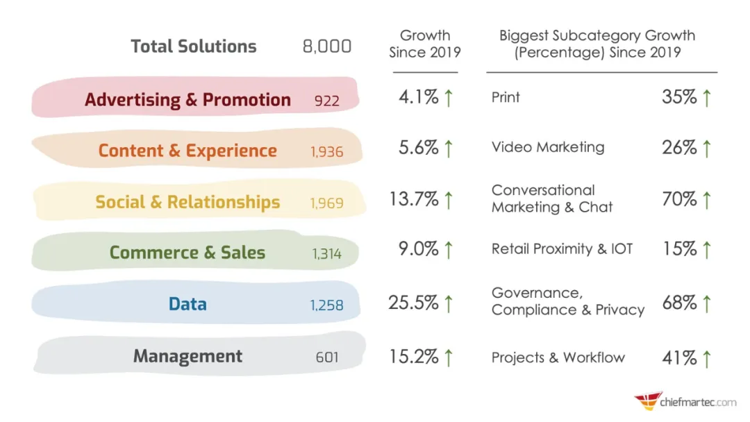 Scott Brinker发布的2020营销技术全景图中显示,2020年新入榜的公司数量几乎与2015年的全部martech公司数量持平,与2011年时的150家公司相比,其增长率更是达到了惊人的5233%。对比之下,国内目前是理念上有所落后,但在数字化的驱动力以及消费者的数字化程度方面很高,因此有理由相信国内MarTech行业同样会高速发展,并且整体发展速度还会更快。