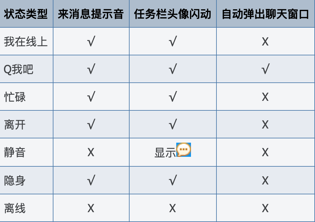 1)作为「即时通讯工具」而言,状态主要解决消息回复及时性的问题,告诉好友你当前的在线状态;那作为即时通讯工具常见的状态有:在线,离线,隐身,忙碌,有事,离开中等等(早期PC端QQ的在线状态)。