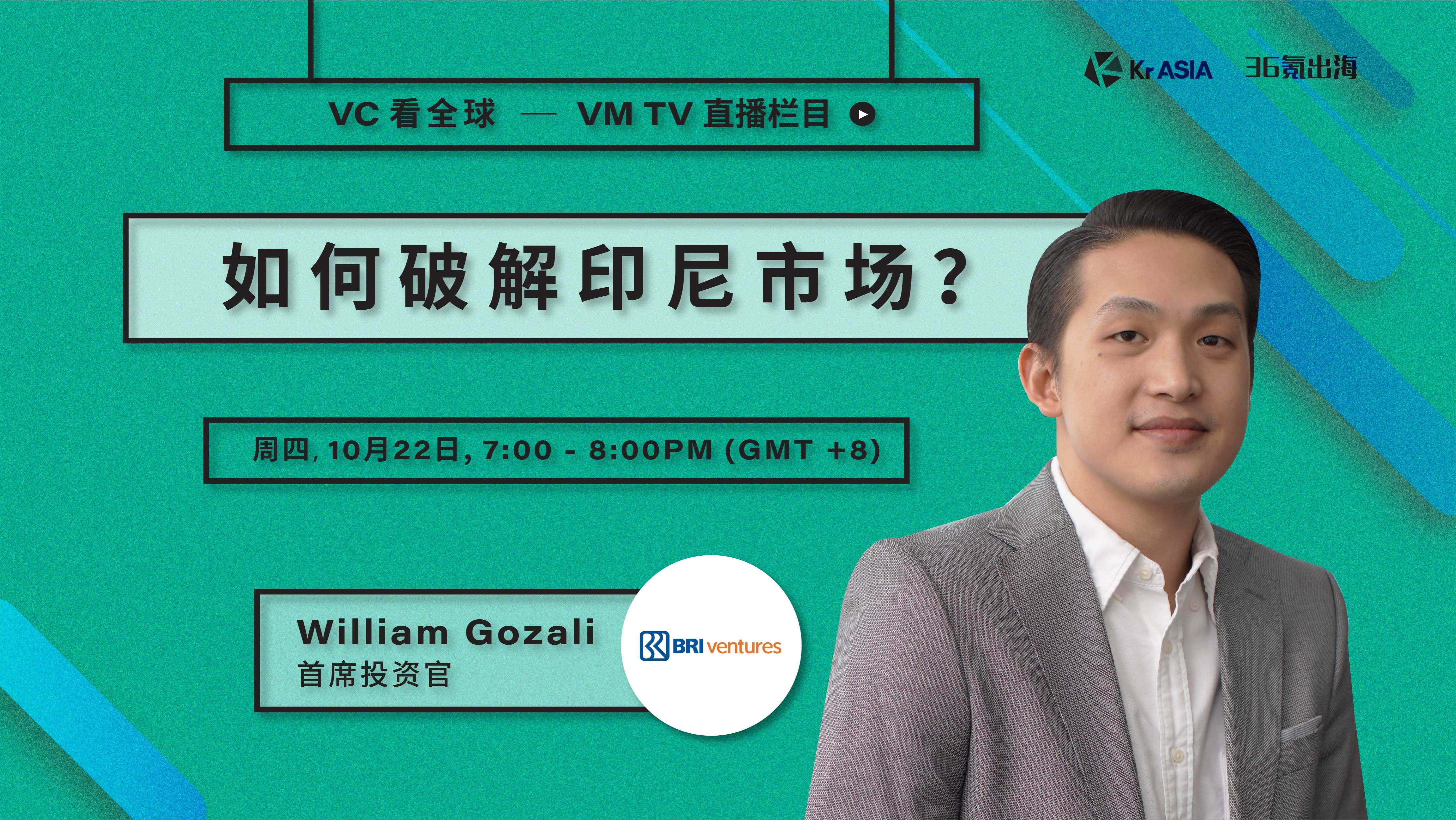 10月22日(本周四)晚上7点,KrASIA 「VC看全球」栏目第九期邀请到了 BRI Ventures 的首席投资官 William Gozali 。