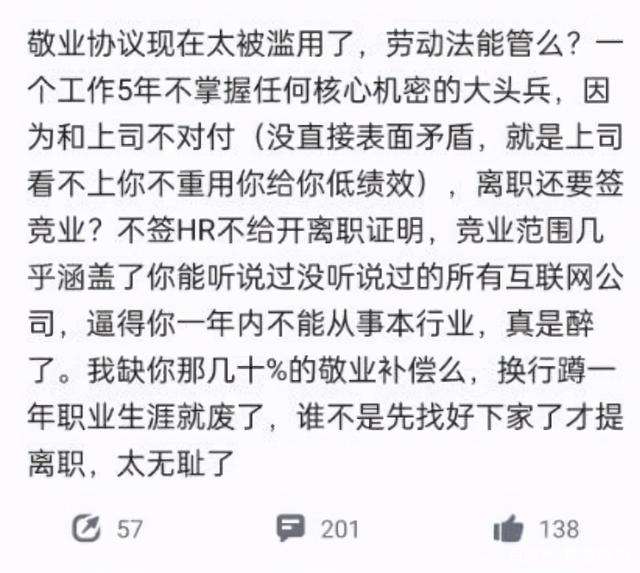 脉脉上某企业员工就表示:“竞业协议现在太被滥用了,一个工作5年不掌握任何机密的大头兵,因为和上司不对付离职时就要签竞业协议”“竞业范围几乎涵盖了你能听说过没听说过的所有互联网公司,逼得你一年内不能从事本行业”“换行蹲一年职业生涯就废了,不签HR还不给离职证明”