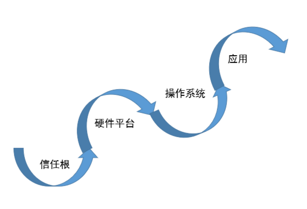在信任根之上为可信任的硬件平台,同理,操作系统经过硬件平台的信任,应用经过操作系统的认证。由于整个链条环环相扣,每个部分都由上一部分可信验证,所以由可信计算组成的IT系统安全性大大提高。