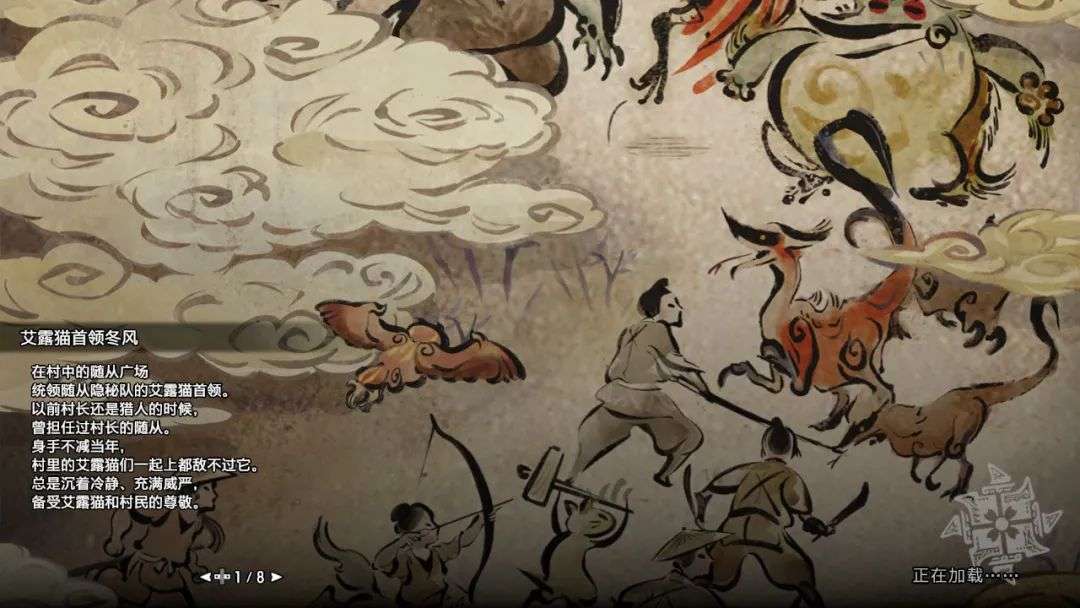 比如游戏的加载画面,就是典型的水墨绘卷,其内容就是人类对抗“百龙夜行”的描绘。