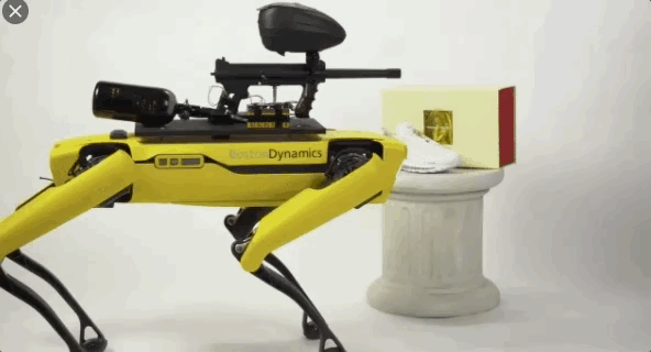 就在2月,美国的一个恶搞组织将一把蒂普曼 98 彩弹枪绑在波士顿动力公司网红机器狗 Spot 的身上,任其在画廊里游荡。