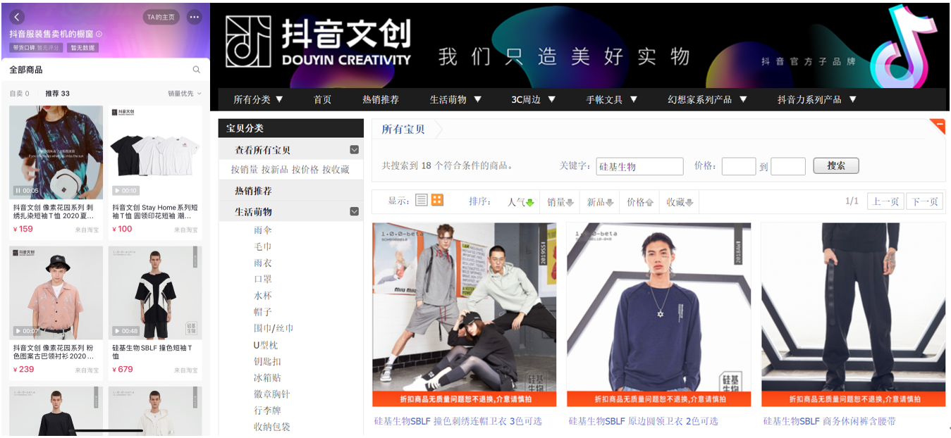 “硅基生物”入驻抖音文创服饰,图片来源:抖音App、天猫旗舰店