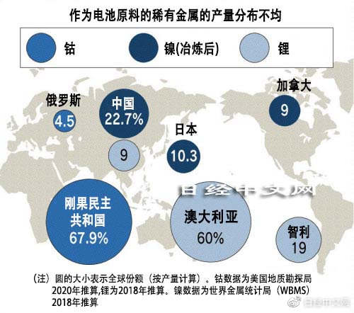 在此背景下,面临的课题是电池和原料的稳定采购。作为锂离子电池原料的稀有金属大部分在日本境外生产。以用于电极的锂为例,澳大利亚占到全球产量的约6成。钴的产量也是近7成来自刚果民主共和国。