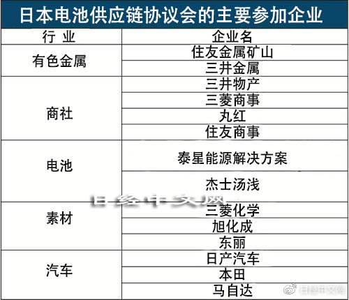 55家企业4月14日举行了新团体“电池供应链协议会(BASC)”(位于东京中央区)的成立大会。会长由住友金属矿山的电池材料业务本部长阿部功出任。此外,松下和丰田共同出资的电池企业泰星能源解决方案(Prime Planet Energy and Solutions,位于东京中央区)、本田、日产汽车、三菱商事、三菱化学和旭化成等也加入其中。