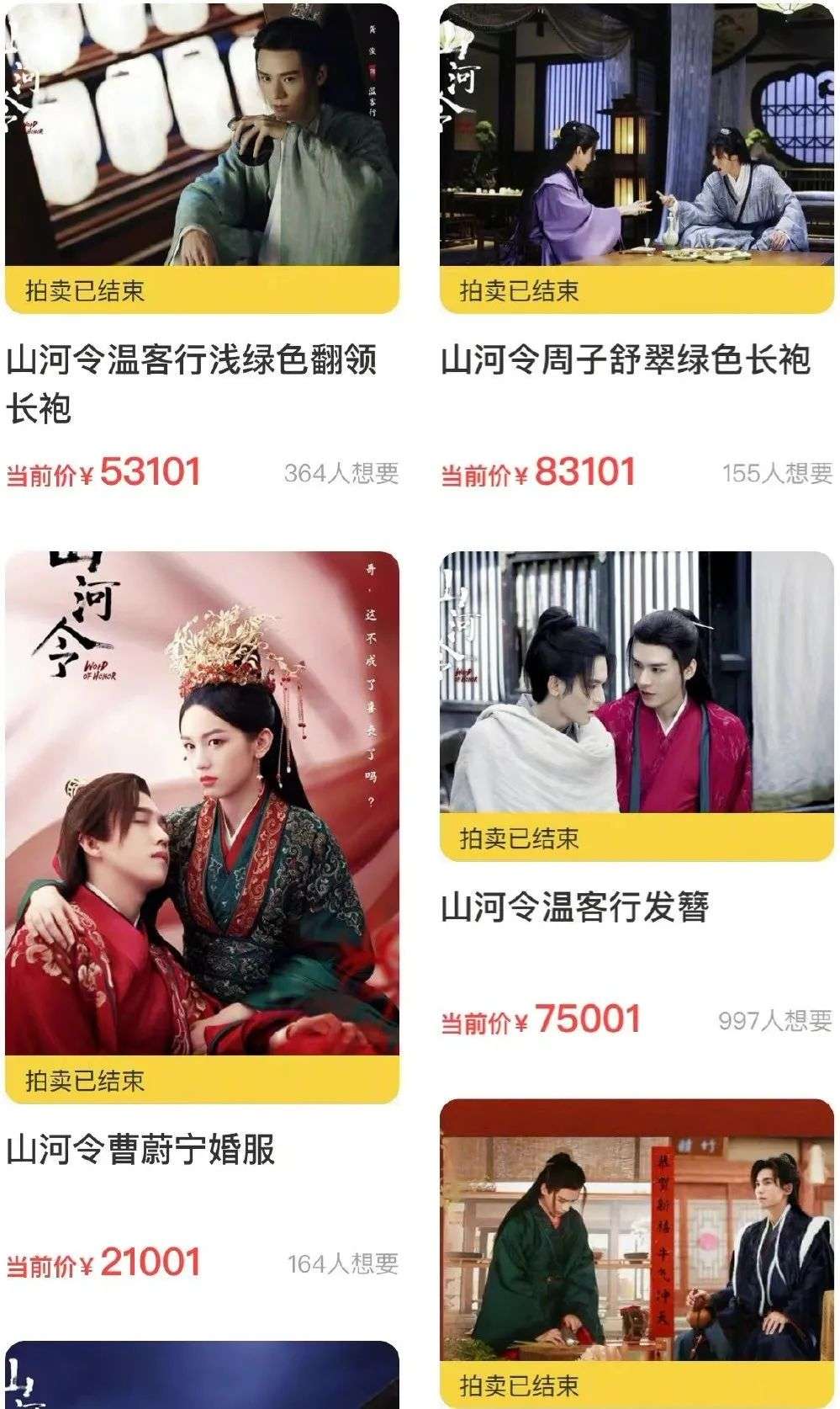 张哲瀚穿过的浅灰色长袍、翠绿色长袍在闲鱼都拍到了8万左右,温客行用过的扇子、发簪也拍到了7万左右。网友们纷纷自嘲“只有我是鬼谷里的穷鬼”。