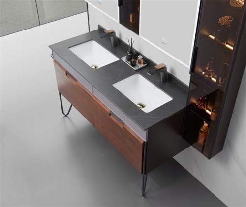 这款浴室柜甄选优质实木、五层大师油漆工艺、考斯威灰岩板台面、主柜双盆设计构造,配备高清智能镜柜,一键智能除雾,三色灯光可调,打开镜柜时还能放置生活物品,侧边的金属毛巾架和镜柜一气呵成,满足人们对浴室柜的所有想象,告别都市慌乱的早晨。