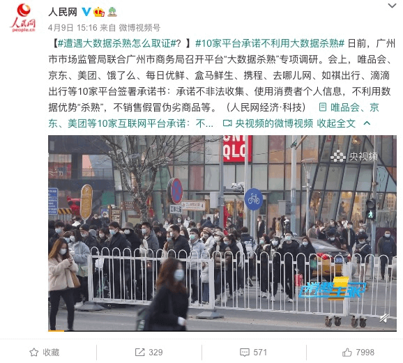 在网民对“大数据杀熟”现象发出不满与谴责后,终于有官方回应了。4月8日,唯品会、京东、美团、饿了么、每日优鲜、盒马鲜生、携程、去哪儿网、如祺出行和滴滴出行共10家互联网平台签署承诺书称:“不价格欺诈、不利用数据优势杀熟。”