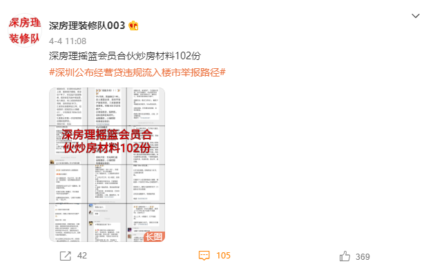 4月4日,微博用户“深房理装修队003”将102份深房理摇篮会员炒房材料公开;四天后,包括深圳市住建局、公安局、市监局、网信办、银保监局等在内的七部门联合发布通告称,已针对网友举报深房理违法违规的炒房行为开展调查。
