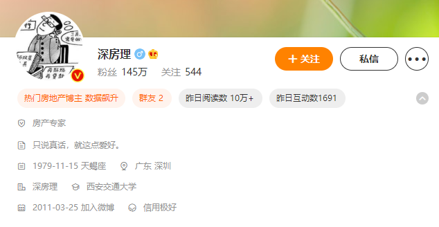 深房理何许人也?资料显示,其本名李雪峰,目前微博粉丝数达145万,曾获“微博2019V+价值榜年度大V”荣誉称号,其长期鼓吹“人人皆可买房,直至财务自由”的理论也收获了大批拥趸。