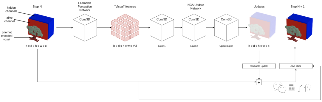 研究者其实是受到「生命游戏」中元胞自动机(CA) 的启发,在2D基础上开发了3D神经元细胞自动机(NCA)。