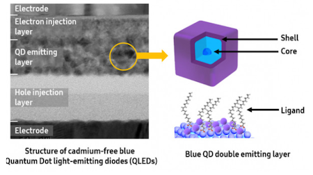 量子点(QD)是直径为几纳米(比一根人的头发窄几万倍)的半导体颗粒,照亮时,它们会根据其大小重新发射某种颜色的光,而蓝色是QLED三种主要颜色中最难实现的颜色。因为它在三种原色中具有最大的带隙,当暴露于外部光时会迅速氧化,导致使用寿命短和发光效率低。
