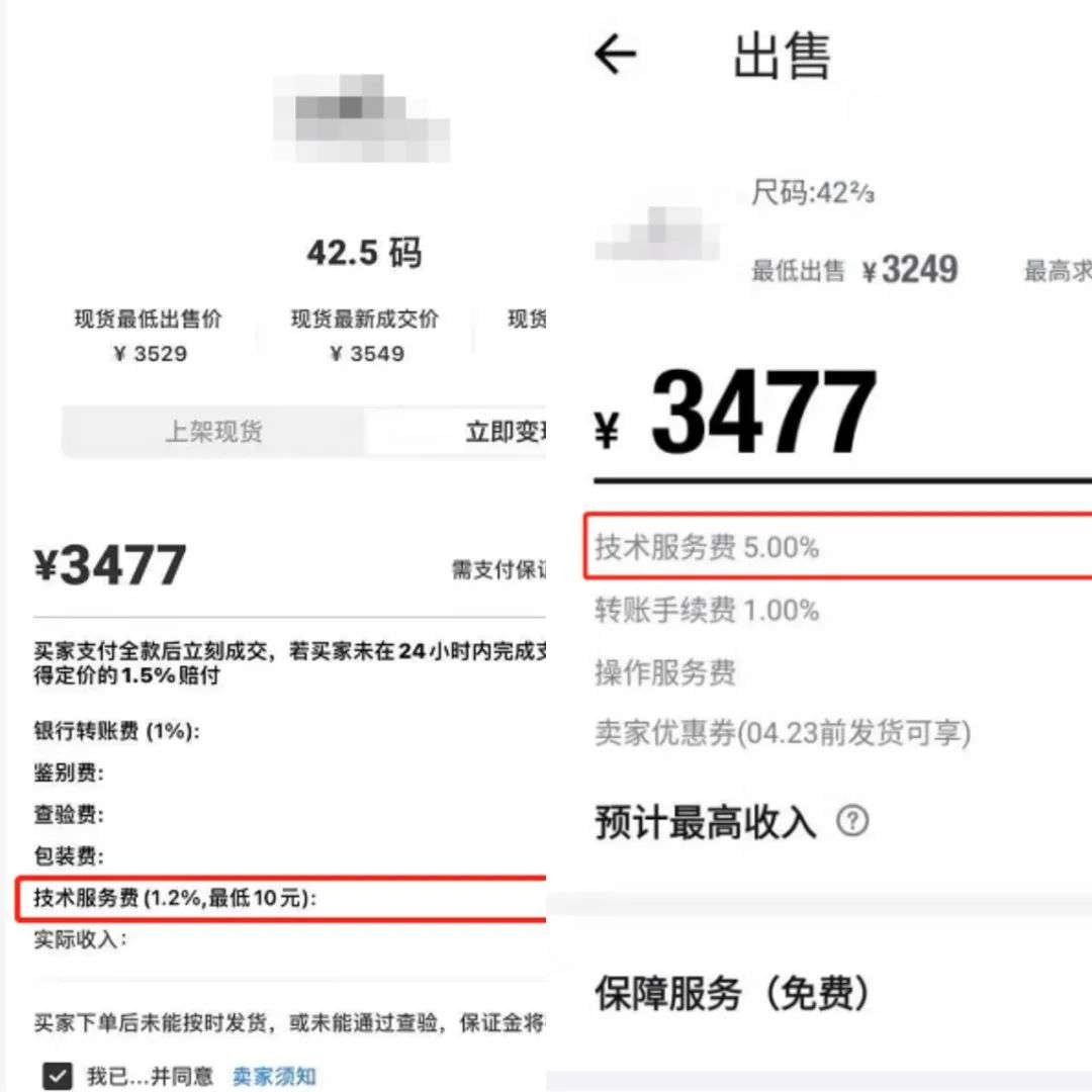 Nice(左)和得物佣金对比 图片来源:受访者供图