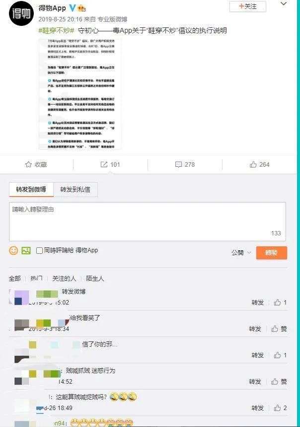 上一次被狠狠打击,还是在2019年10月,央行发文警示“炒鞋热”背后的金融风险,其中对得物、nice、有货、95分等潮鞋交易平台做出了点名批评。彼时得物(曾用名“毒App”)和nice都发出“鞋穿不炒”的声明,但仅从微博评论上的互动来看,网友们并不买账。