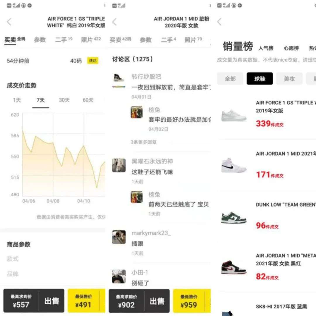 为了提高交易效率,美国的炒鞋平台率先推出阿迪、耐克、AJ指数,国内的近十个球鞋交易平台随之跟进。销售榜、涨跌榜、价格曲线……平台跳动的数据是永不疲惫的金钱,无时无刻不在刺激着玩家的神经。