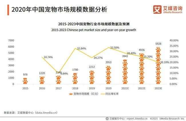 艾媒咨询的数据显示,2015-2020年中国宠物市场规模呈持续增长态势,2020年市场规模为2953亿元,同比增长33.5%。预计到2023年,中国宠物行业市场规模将达到5928亿元。