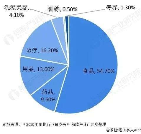 根据《2020年度中国宠物行业白皮书》,宠物食品的市场份额占比最高,达55.7%。其次是宠物诊疗、用品和药品,分别占比16.2%、13.6%、9.6%。
