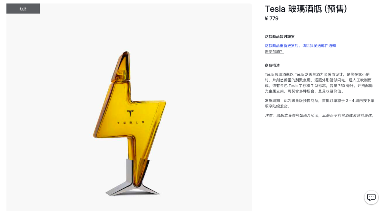 近日,特斯拉在中国官网上线了一款“龙舌兰酒”空玻璃瓶,预售价779元/件。令人惊讶的是,短短两天的时间,玻璃酒瓶全部售罄。目前,特斯拉官网显示空酒瓶呈暂时缺货的状态。