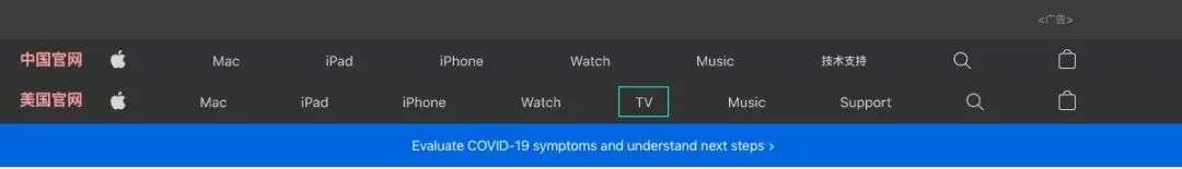 我给个提示,观察一下顶栏,国内分别是 Mac、iPad 、iPhone、Watch 和 Music,而美国版还多了个 TV。