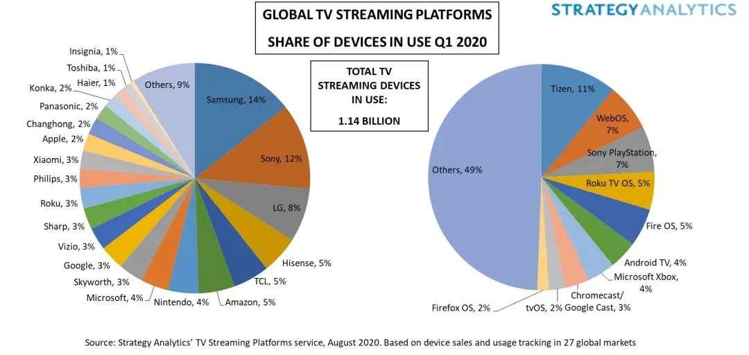 Apple TV 的市场占有率与其在苹果生态中的地位极不匹配,从 Strategy Analytics 2020 年对全球电视流媒体设备的调查中可以看出,Apple TV 的市场份额仅 2%。